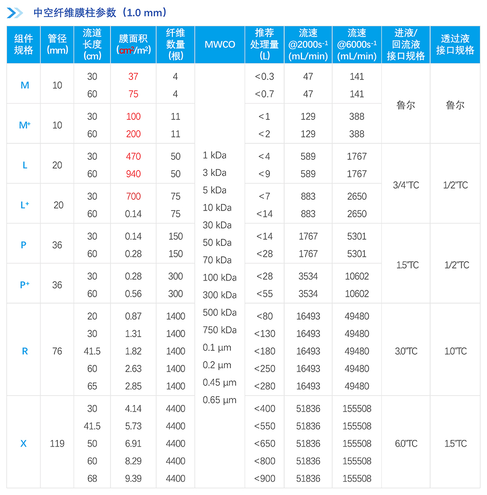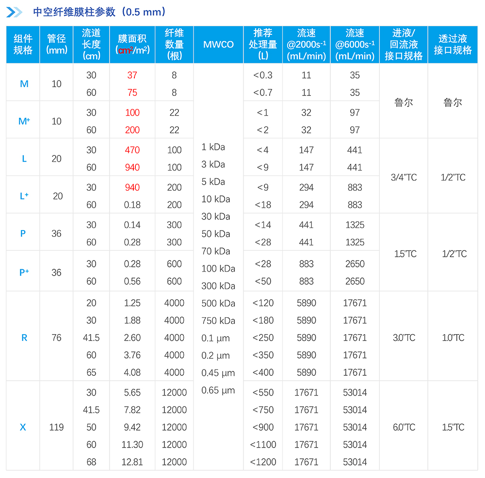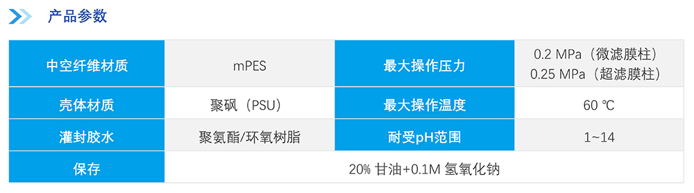 中空纖維膜絲采用改性聚醚砜(mPES)制備,抗污染性能強;非對稱梯度孔結構及均一孔徑保證高過濾精度的同時能獲取更高通量,提高產品收率。中空纖維膜柱采用符合醫療級別的外殼材料,生物相容性優異,在滅菌環境中穩定性優良;選用的膠黏劑粘接強度高,耐熱性、耐化學性及生物相容性優良;同時采用優化的注膠工藝,注膠精度高,產品無缺陷。